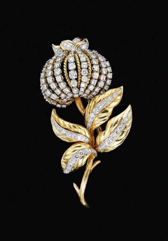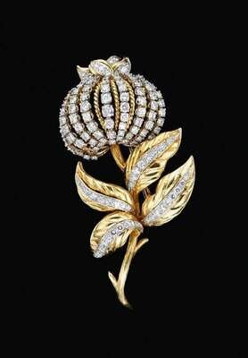 18 karat yellow gold, diamond and "pommegranite" blossom brooch 1950s