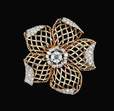 Flower form centering a round about .75 carats and surrounded by nine petite cut baguette diamonds and nine petite cut round cut diamonds. Each petal is turned up and displays on petal tips a total of approximately ninety petite round cut diamonds.