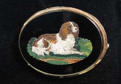 Seated spaniel reclining in tall grass, set into onyx with a low karat yellow gold frame.