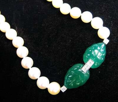 Forty-eight 7mm pink luster cultured pearls set an emerald spacer, of two cabochon carved emeralds in the general shaped of a leaf separated by three petite round cut diamonds.