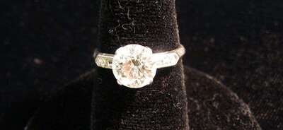 Round center diamond weighing approximately 1 carat and flanked by two baguette cut diamonds.