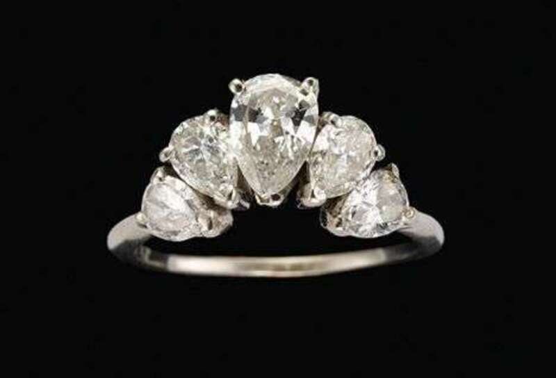 Set with five graduated pear shaped diamonds in crescent form. Total weight of diamonds approximately 1.2 carats.