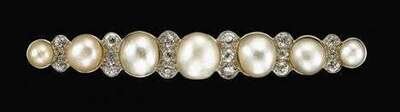 Centering seven natural pearls with excellent silver cream luster, each pearl is seperated by three Old European cut diamonds of varying size, the total diamond weight is 1.35 carats.