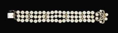Triple strand pearl bracelet with platinum and diamond spacers and a large diamond set clasp.