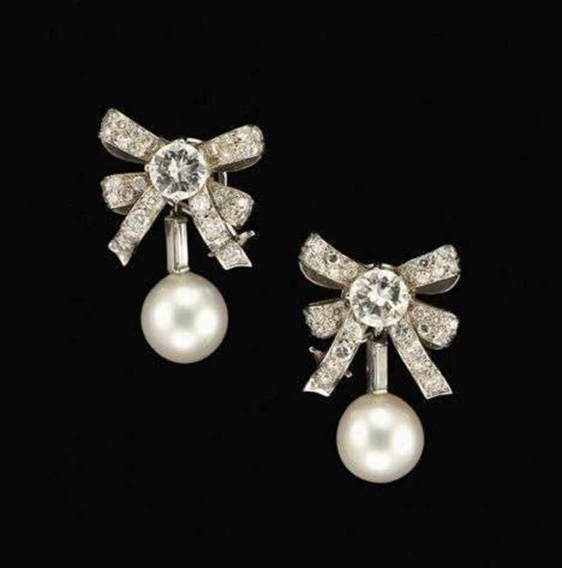 Each set with an 11mm pearl, single round diamond about 1.20 carats and thirty-three minute round diamonds.