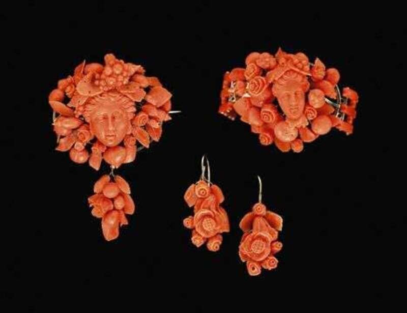 Articulated coral bracelet, brooch and ear pendants wire set. Accompanied by original box.