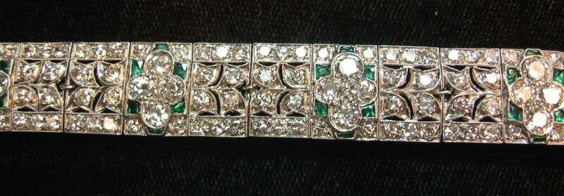 Platinum, diamond and emerald Art Deco flexible bracelet 20th century