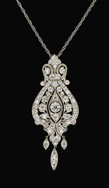 Crown shaped top, cartouche shaped center with three short drops. A center round diamond about .75 carat, sixty-one graduated round diamonds with a total weight of approximately 3 carats.