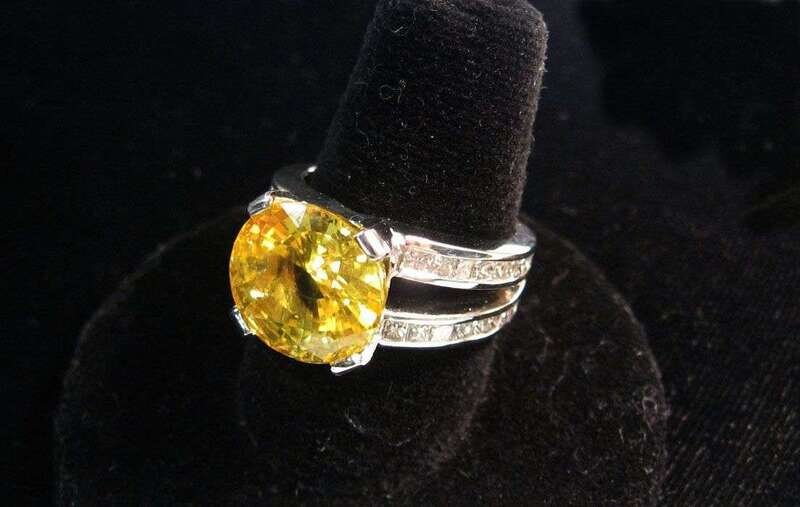 Oval cut yellow sapphire about 9.7 carats, framed by princess cut diamonds, total diamond carat weight is approximately 2.5 carats.