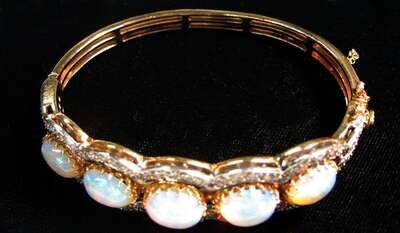 14 karat yellow and white gold, opal and diamond bangle bracelet 1950s