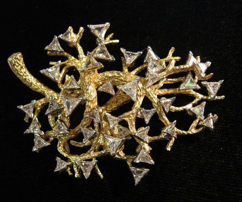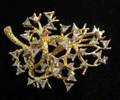 Rustic tree form brooch set with approximately thirty-eight triangular cut diamonds of varying size. Total diamond weight is approximately 3 carats.