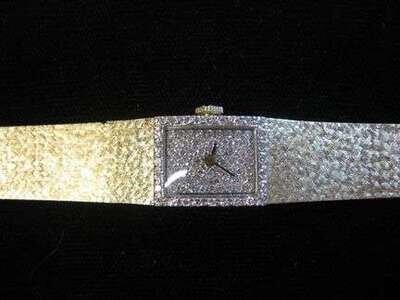The rectangular face and bezel features approximately ninety-six petite round cut diamonds, including textured gold bracelet.