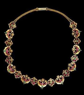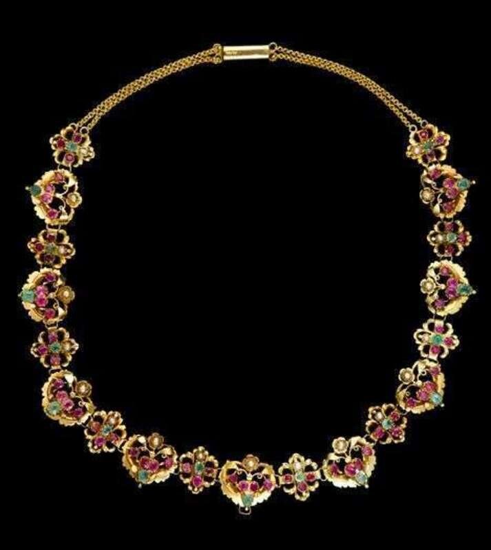 Eastern Indian yellow gold, emerald, ruby and seed pearl necklace