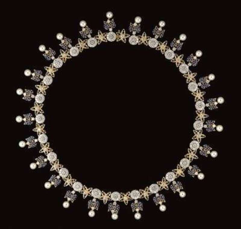 Impressive 18 karat yellow gold, sapphire, diamond and pearl necklace