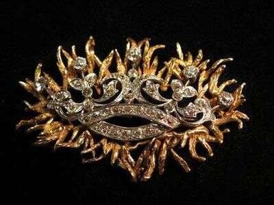 Traditional Edwardian design, set with approximately thirty-eight round Old Mine cut diamonds. Brooch has been enhanced by hand wraught 14 karat yellow gold jacket resembling a textured "flame" motif.