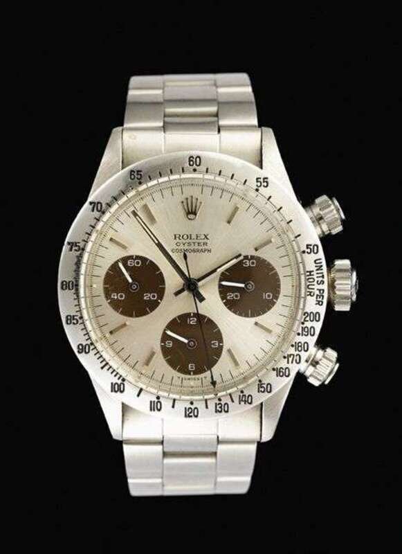 Stainless steel case and bracelet with registers and tachometer.