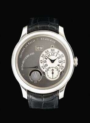 Date, register eccentric movement, battleship gray dial with day/night indicater, Nivatronic, 21,699 A/h. Limited edition of 99, number 90/99-02A. Accompanied by a certificate of authentification, including a mahogany case with eye magnifyer and tool to remove the back.