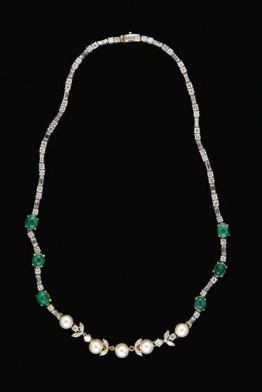 Diamond line necklace set with fifty round diamonds, two square cut diamonds, eight marquise cut diamonds and twenty-eight baguette diamonds, total weight of all diamonds about 3.85 carats, accented by six oval cabochon emeralds with a total carat weight of about 6 carats and centering on five 7mm light cream luster cultured pearls.