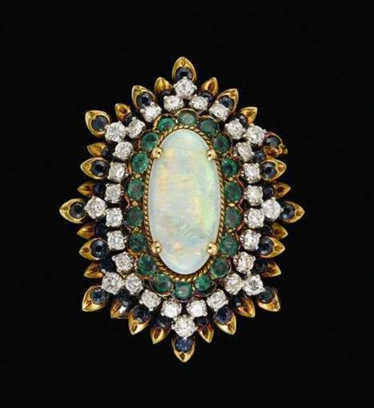 Large 18 karat yellow gold, opal, emerald, sapphire and diamond brooch