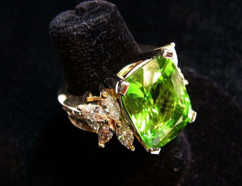 9.5 carat peridot framed by a marquise diamond eternity band, total diamond weight 2.5 carats.