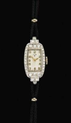 Oblong case set with thirty graduated round diamonds with a total weight about .75 carat, black double cord band.