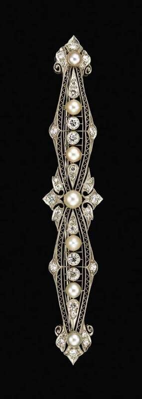 Seven cream colored cultured pearls in filigree setting, and accented by twenty-four round Old Mine cut diamonds of varying size, total carat weight is approximately 1.5 carats.