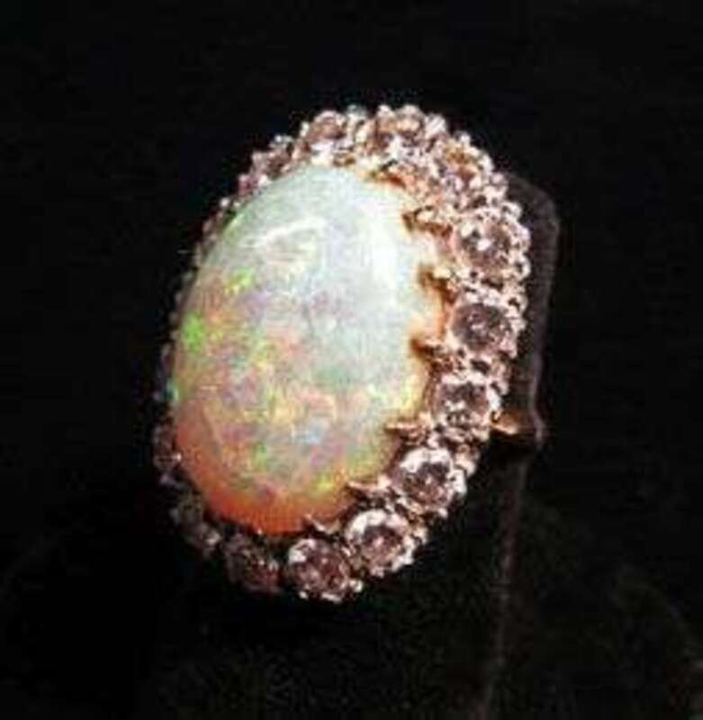 Large oval opal framed by fifteen round cut diamonds, approximately .15 carats each.