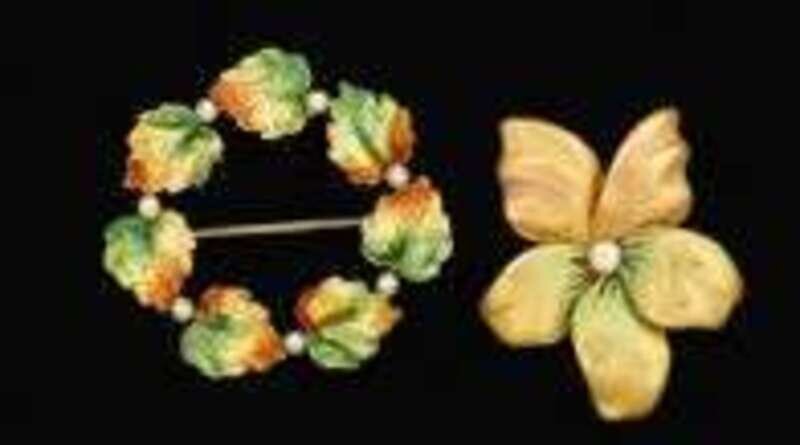 Wreath style with green, yellow, and brown leaves separated by seed pearls and iridescent flower, bronze and green enamel each with pearl in center.