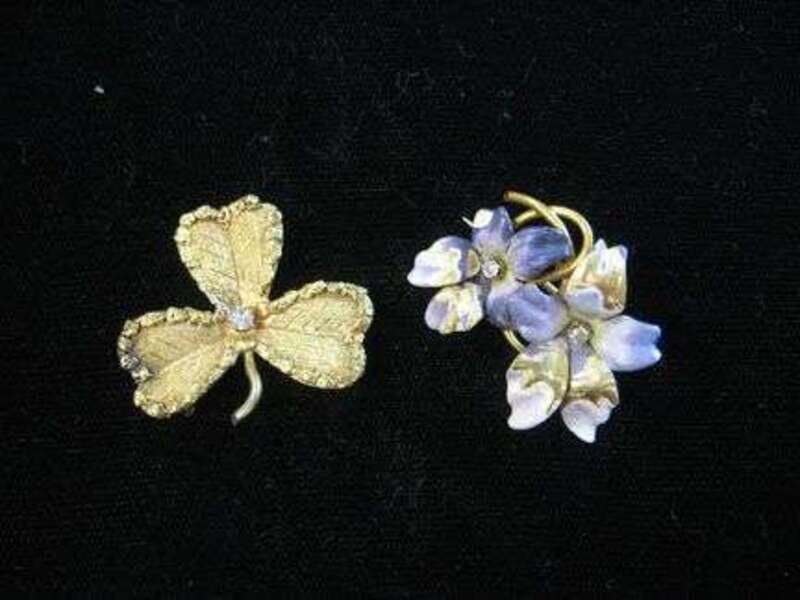 One gold three-leaf clover with diamond center, two entwined lavender flowers with diamonds in each,.