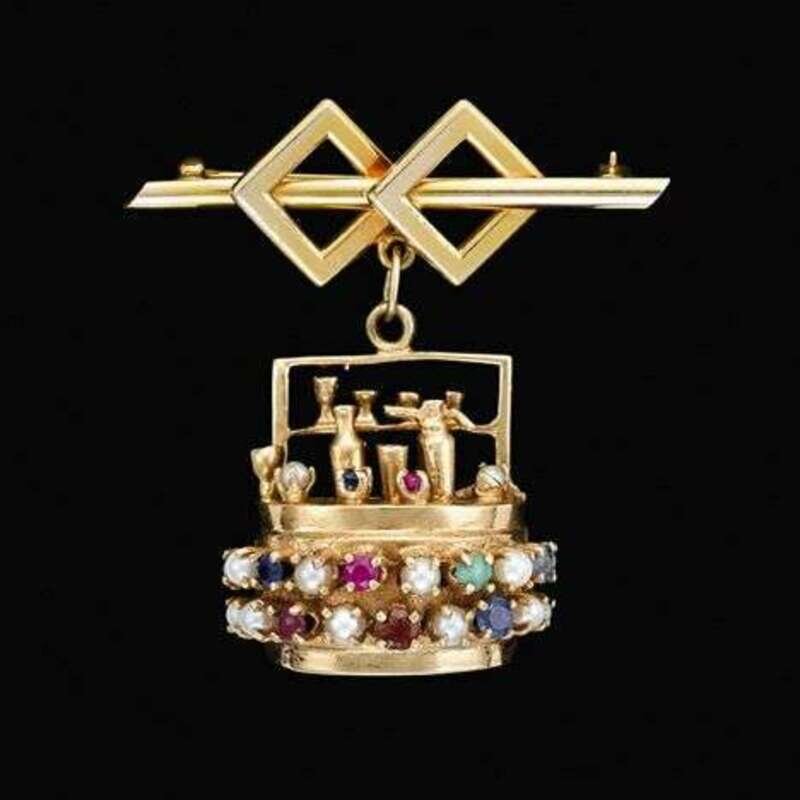 Unusual heavy weight, depicting a bar scene. Set with gems of varying quality. Pin portion is 12 karat yellow gold fill, charm is tested as 14 karat.