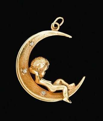 In the style of Ruser, cupid rests atop a cresent moon, set with six Old Mine cut diamonds.