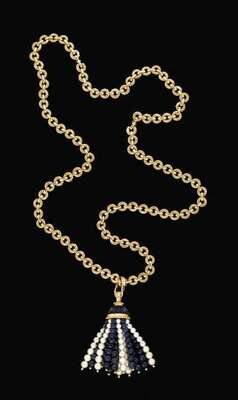 18 karat yellow gold, pearl and lapis sautoir necklace contemporary