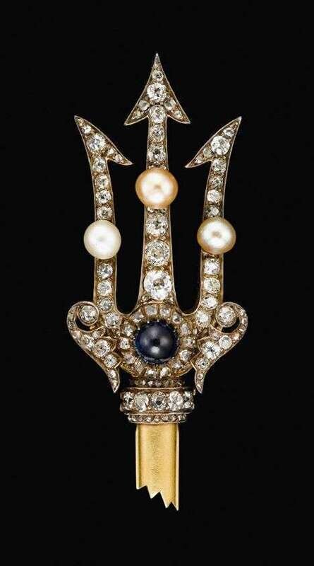 Trident form of sterling silver over yellow gold set with bright sapphires, fifty-nine Old Mine cut diamonds and three natural pearls of varying color. Displays metal hallmarks for Czechoslovakia.