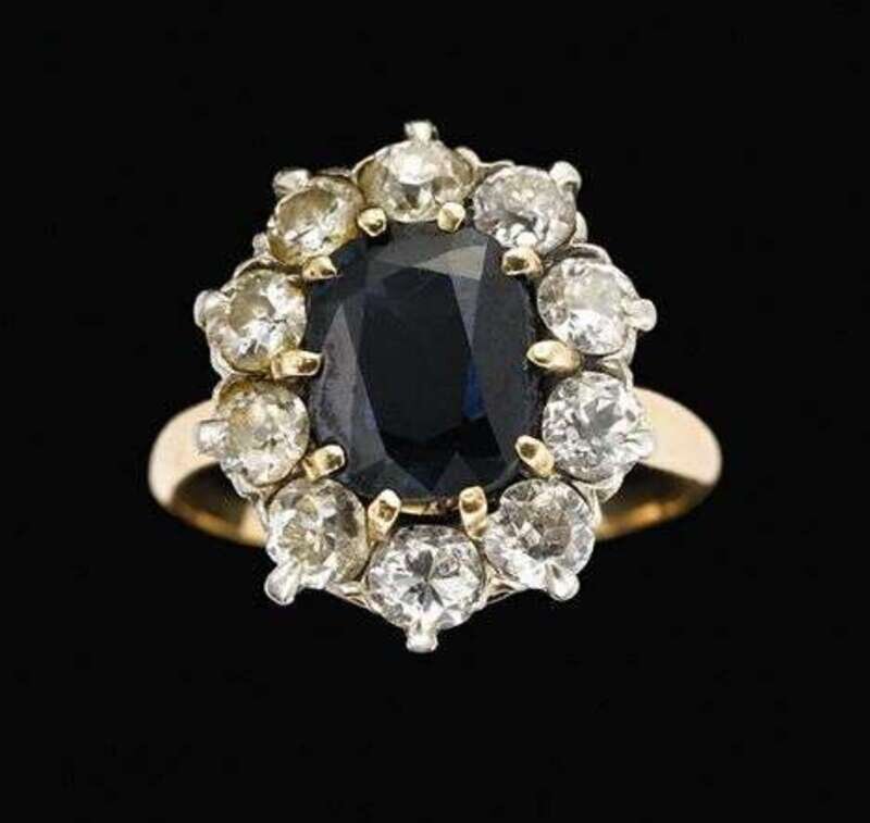 Dark blue sapphire with a modified oval frame of ten prong set .10 carat Old European cut diamonds.