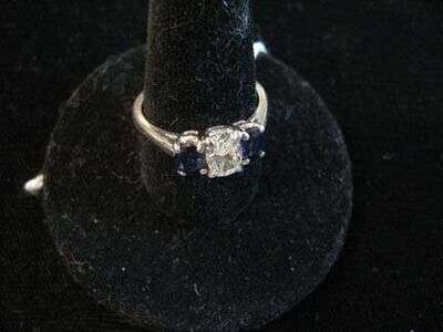 Delicate .50 carat oval cut diamond flanked by two oval cut sapphires.