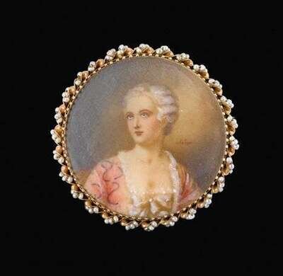 Lady in wig and pink dress, pearl encrusted gold frame.