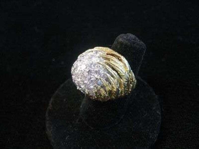 Feather motif setting, accented by round cut pave set diamonds in white gold.
