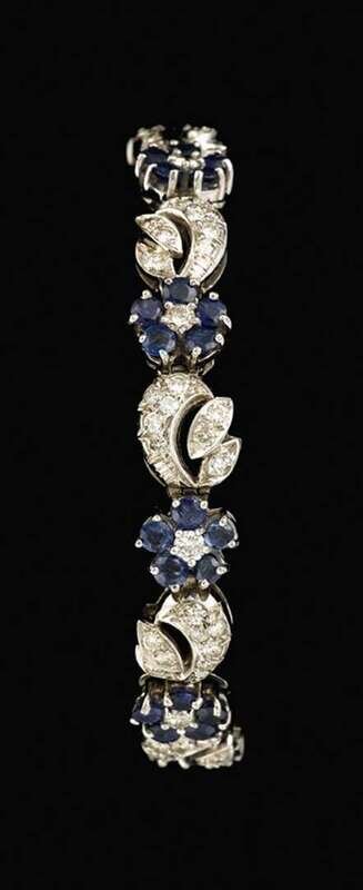 Flower and garland motif with forty-five sapphire flowers and approximately seventy-two white diamonds. Bracelet features safety clasp and chain.
