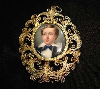 Portrait miniature of a yound boy set into an oblong yellow gold like filigree moulded panel. Features a pendant-like hook.