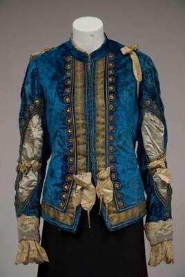Teal velvet with cream silk, lace and ribbon trim, with metallic embroidered details, open front and lined in cotton twill. With an associated hat, both labeled "Waas & Son / 226 N. 8th St., Philadelphia."