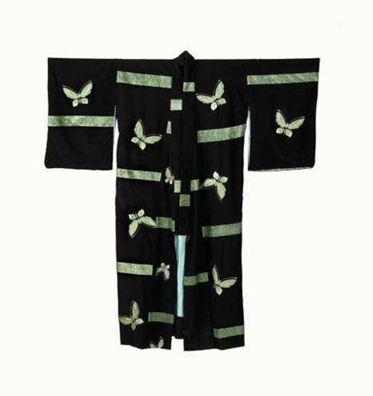 One shorter in black, with a very elaborate scene of Mt. Fuji woven into the interior; the other longer in black with metallic green stripes and embroidered butterflies.