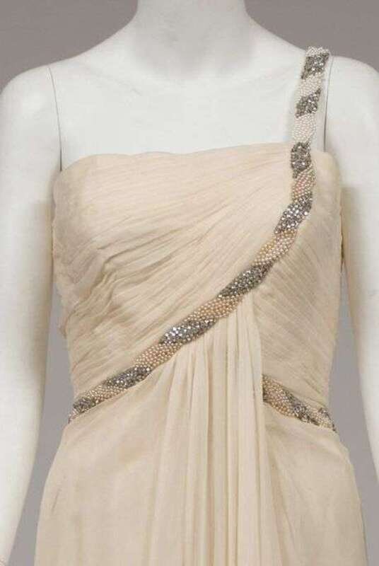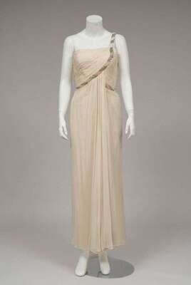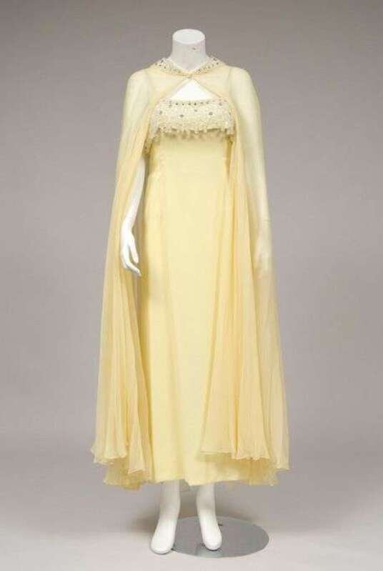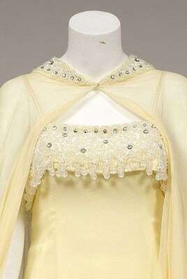 Shirred shaped bodice with pearl and rhinestone "twisted" trim below the bust and curving up to form a single shoulder strap; with a shawl. Together with a yellow beaded chiffon gown and sheer cape.