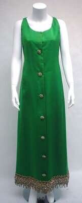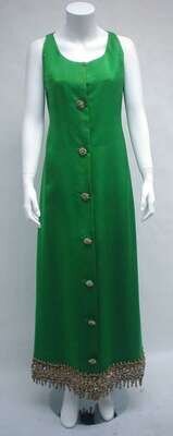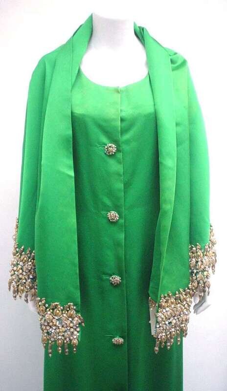 Sleeveless sheath with gold and crystal beading at the hem and decorating the buttons at front; with a matching shawl with heavy gold and jewel encrusted edging. Labeled "Christian Dior / Paris / Made in France," size 8.