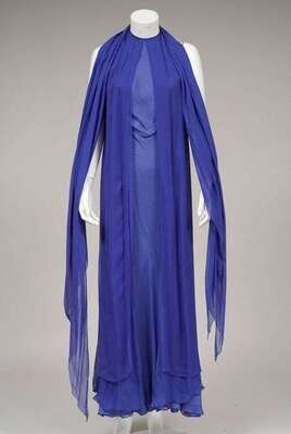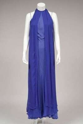 Royal blue layered sheer silk draped A-line full length evening dress with pale blue underlayer, halter neckline, cut-out arm openings and narrow cord straps at the back, and with two matching long chiffon scarves.