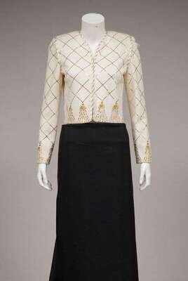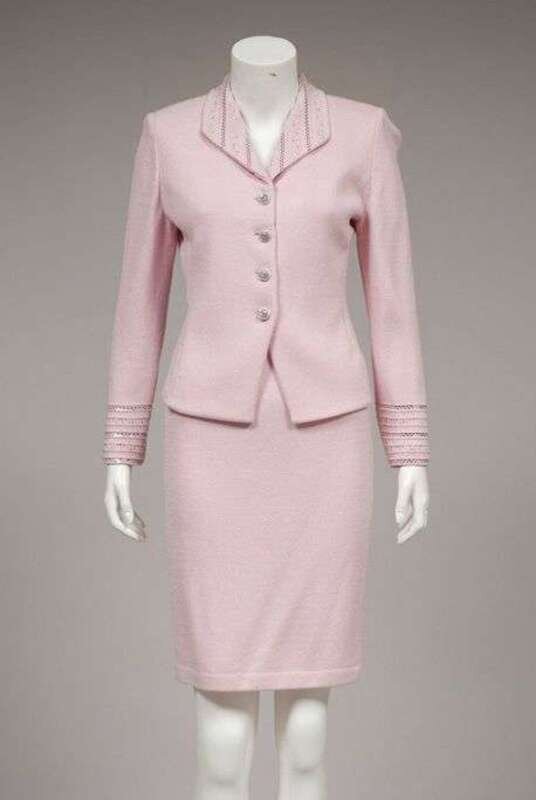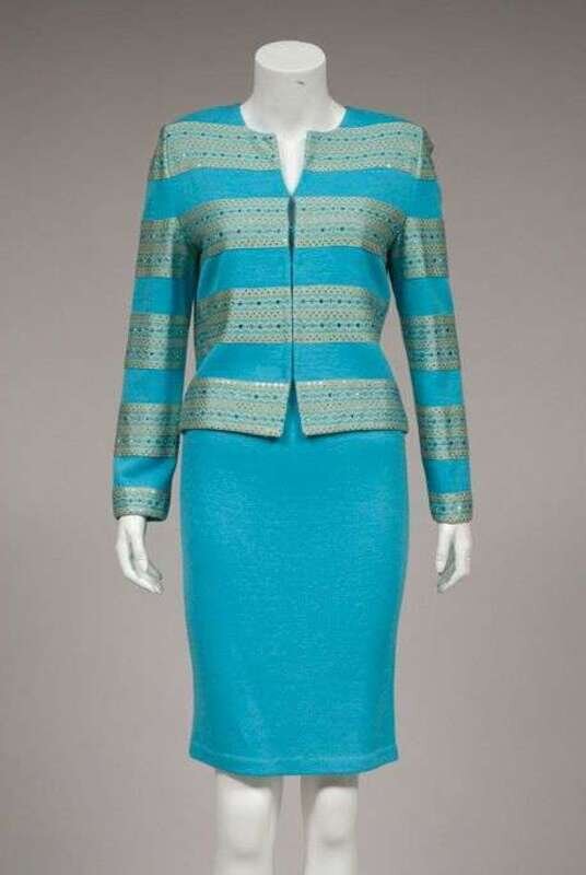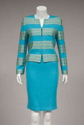 In turquoise and pale lavender, together with a cropped St. John Evening jacket in cream, with gold details. All size 2.