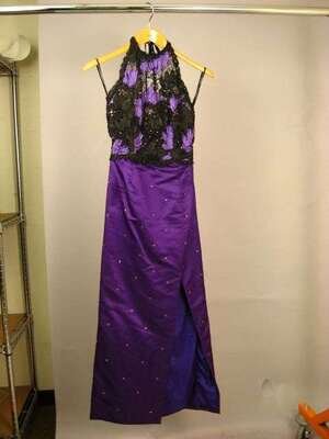 Bright violet satin and black and purple Guipure lace halter dress with rhinestone embellishment and high slit at the side.