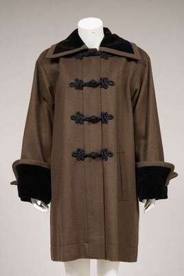 Chocolate brown felted wool with black velvet trim at the cuffs and collar, with black frog toggle closures, welt pockets. Size 40, labeled "Saint Laurent / Rive Gauche."