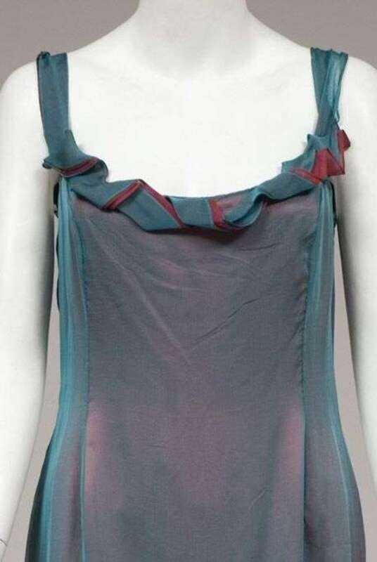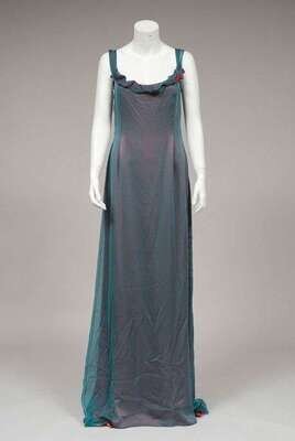 Sheer teal silk chiffon over rose silk satin, with a twist detail at the bust with thin spaghetti straps and silk straps meant to fall off the shoulder, floor-length with a slight train. Size 12.