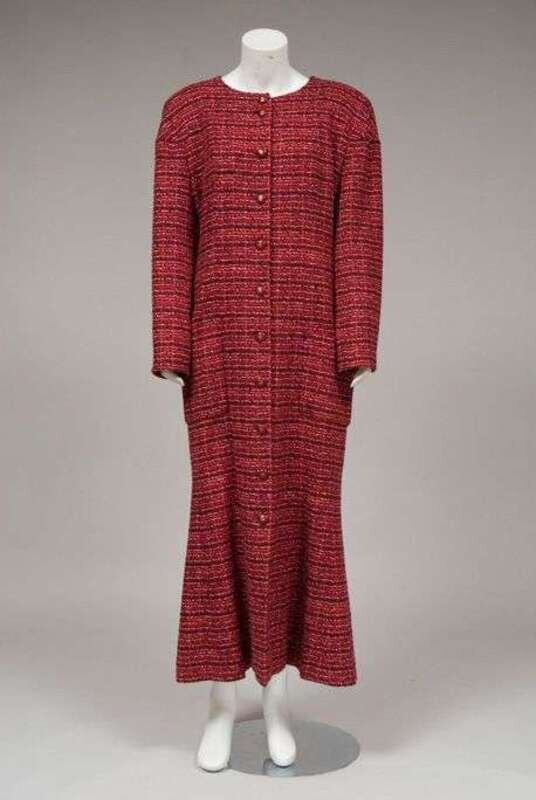 Full-length wool coat with multi-color flecks, matching attachable short fringed scarf with button at the back of the neckline, button-up front with patch pockets. Size 44.