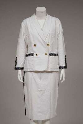Double-breasted blazer with a shawl collar and a straight skirt, with black lace trim on both pieces and round gold "Coco bottle" buttons. Size 42.